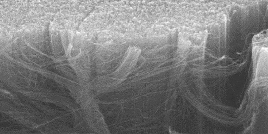 「Vanta」其實是「垂直排列碳納米管陣列」的縮寫(Vertically-aligned nanotube array)。這種納米管的粗細只有頭髮絲直徑的萬分之一,光粒子都無法從其中通過,研究人員將它們在垂直方向上排列整齊,從微觀視角觀察,就像是一片片拔地而起的森林。當光線入射到納米管陣列后,就會不斷地偏折,反彈,直到最后被完全吸收。簡單理解,梵塔黑材料之所以這麼黑,就是因為光線在「碳納米管森林」中「迷了路」。