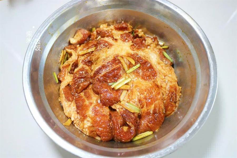 4,肉腌制好了,把蔥、姜挑出來不要。