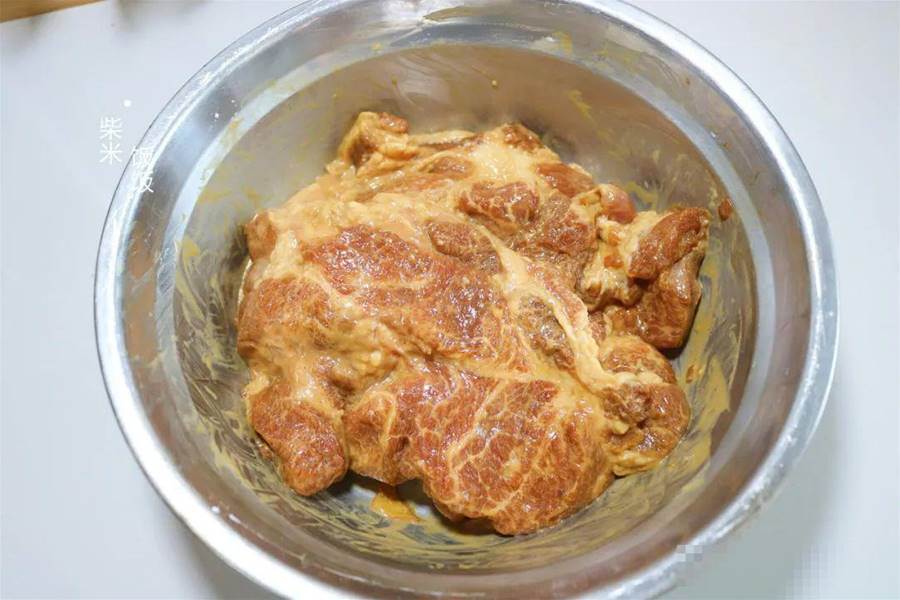 加一勺淀粉進來,再次抓勻。使肉排的表面裹上一層薄薄的淀粉,可以減少肉排里面的水分流失。