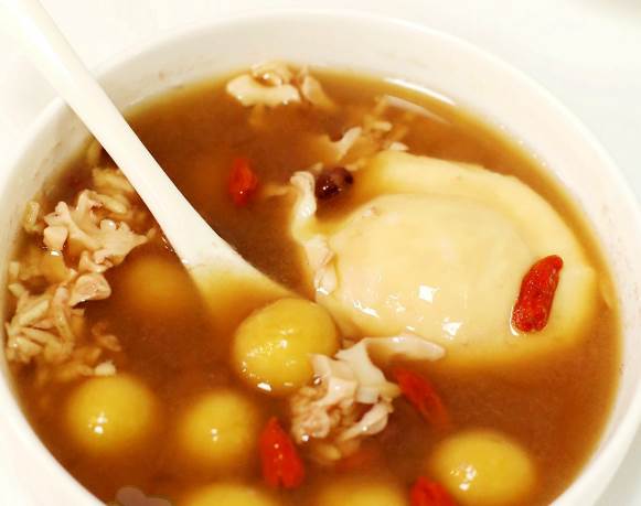 打入雞蛋。鍋里食材都熟后加入醪糟、紅糖、枸杞,拌勻即可。