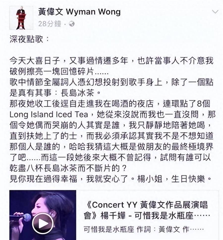 錯過了即是錯過了,兩人大概再回到起先;聽說楊千嬅關于這段愛情的收場也曾難受過非常久,有點夜晚還走進酒吧點了八杯長島冰茶,後來這事兒被見證者黃偉文寫進了歌里。