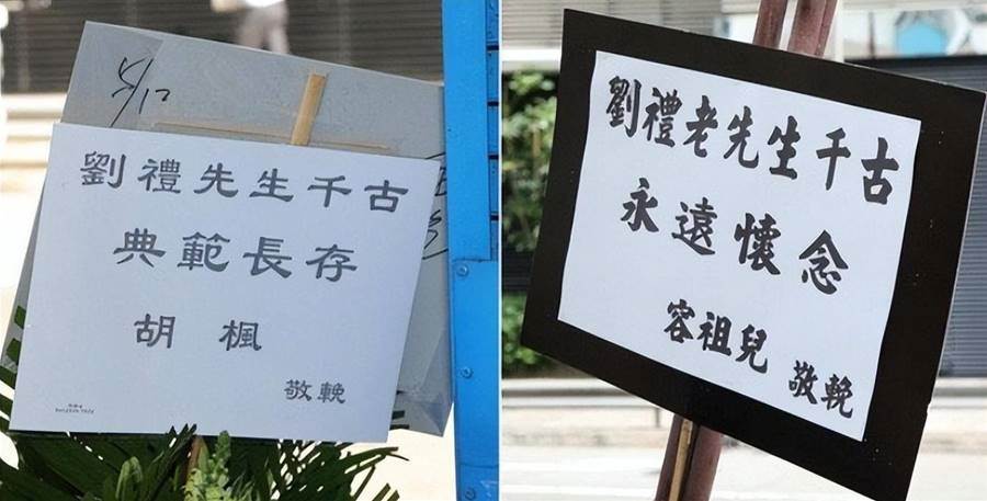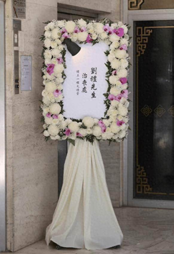 5日中午12點,殯儀館門口擺放了劉禮設靈位置的靈堂門牌,并寫著「劉禮先生治喪,請上一樓大禮堂。」
