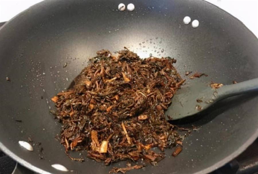 與此同時,我們需要將洗干凈的梅菜放入無水無油的鍋里煸炒,炒干水分后盛出備用。