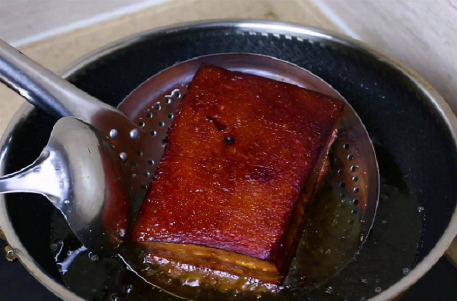 然后,我們需要將五花肉放入低溫油炸鍋中,用熱鍋涼油的方式炸至其表皮顏色暗紅。這個過程需要注意火候的掌握,如果火候過大,五花肉的外皮容易炸焦,如果火候過小,五花肉的內部又不容易炸熟。因此,我們需要掌握好火候,讓五花肉炸至恰到好處。