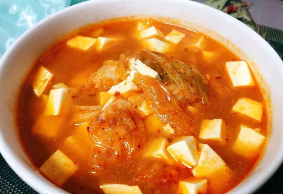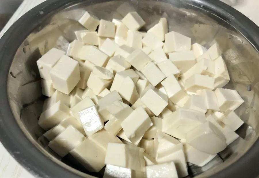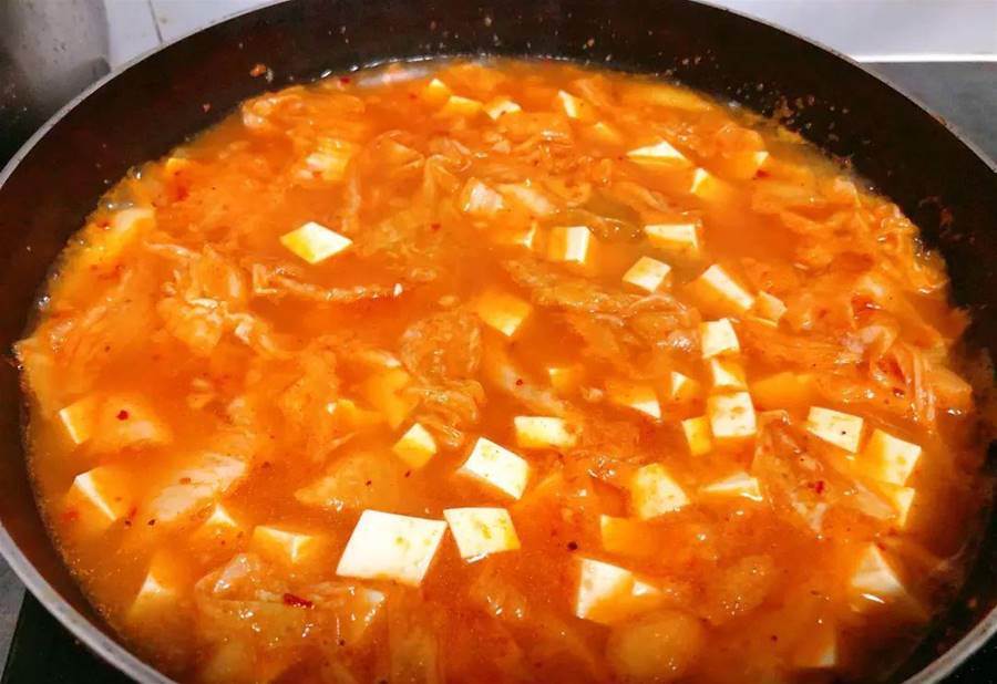 (4)然后把豆腐丁,醬料倒進去燉10分鐘左右,出鍋前加鹽調味