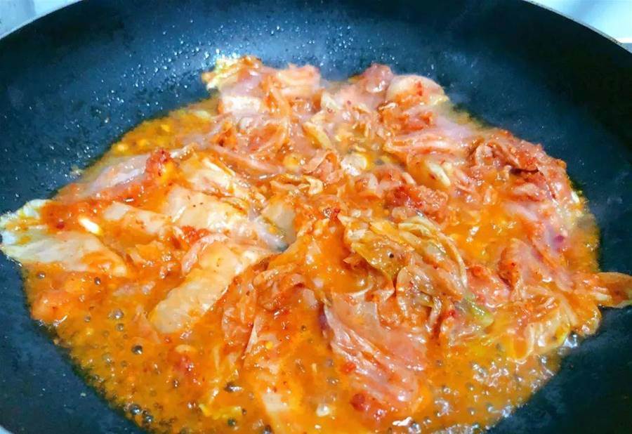 (3)鍋中倒油把泡菜倒進去炒1分鐘,加兩碗水煮開