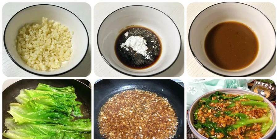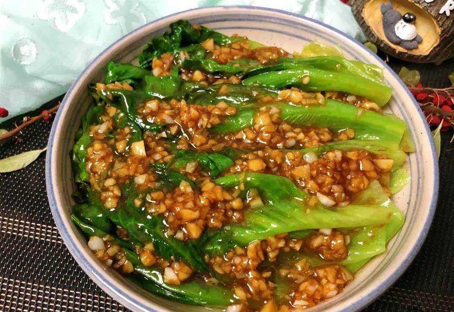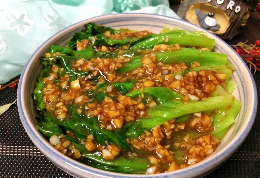 (5)最后將炒好的蒜蓉汁淋在生菜上面,就可以上桌了