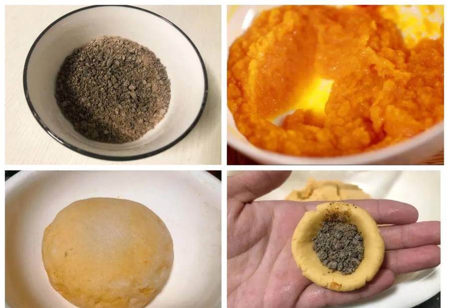 (3)蒸好后的南瓜倒入盆里趁熱搗成泥,接著分多次加入糯米粉攪拌,攪成面疙瘩揉成光滑不粘手的南瓜面團,蓋上蓋子醒一會面
