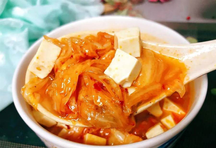 (2)然后把辣白菜剪成小份,準備一塊嫩豆腐切成小方塊