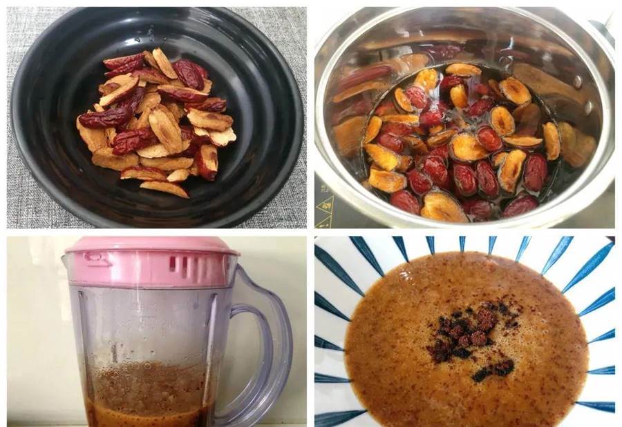 (3)放到溫熱不燙手的時候倒入料理機,把煮棗的水也倒進去,打成棗泥