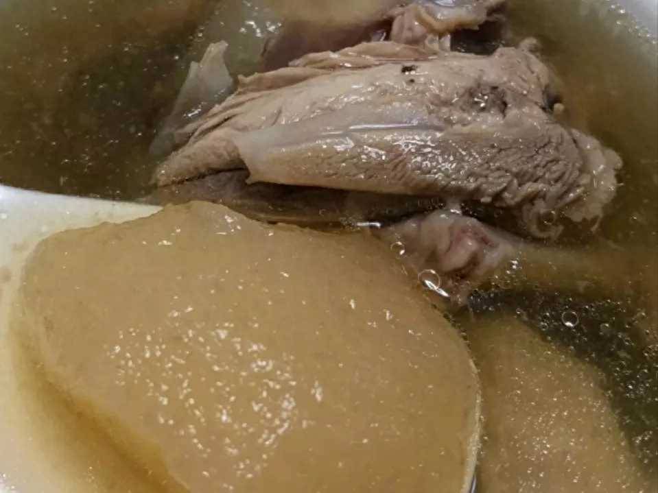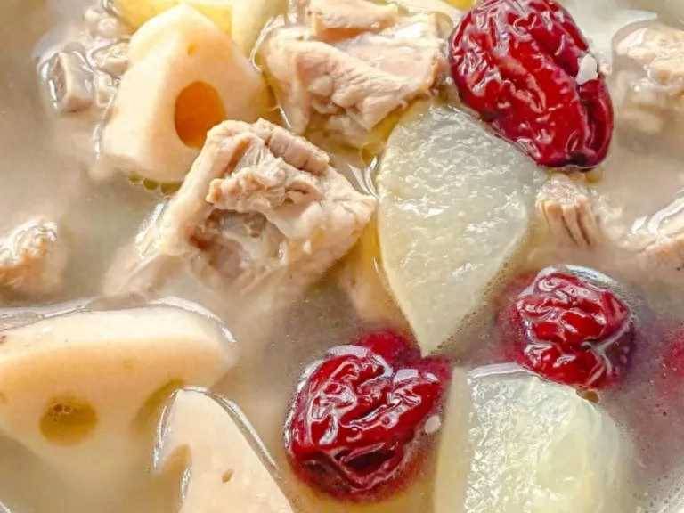 3、將排骨、蓮藕、姜片放入湯鍋中,加入適量的清水,開大火煮開后轉小火燉煮四十分鐘。接著放入雪梨和紅棗,繼續煮二十分鐘。