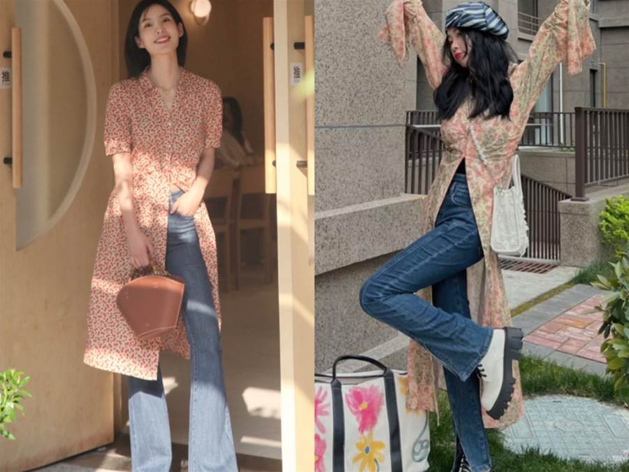像上面那兩位女生一樣,她們選擇的碎花裙是高開叉的,搭配淺藍色的微喇牛仔褲能夠平衡碎花裙的視覺效果,以突出碎花裙的亮點。