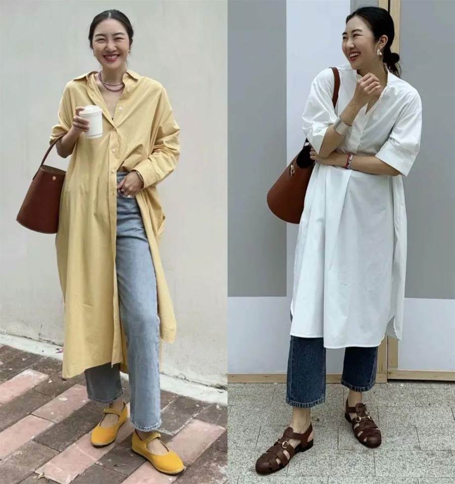 在搭配的時候,可以像上方圖左那位女生一樣,把襯衫裙敞開,塞一點到直筒褲里面。能有效展現腰線,讓你的腿看起來更長。