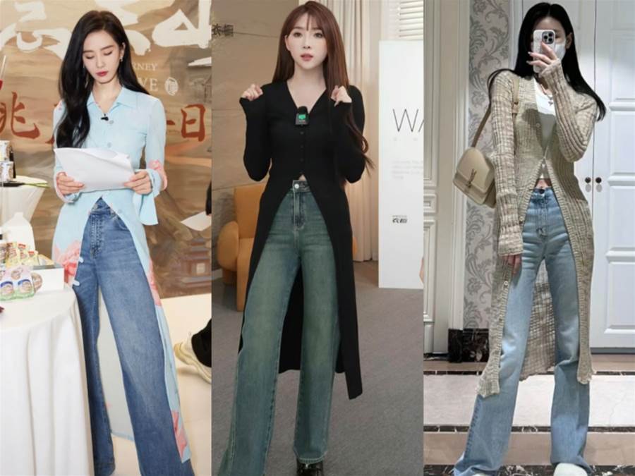 比如針織長裙搭配牛仔褲就是一套非常顯瘦顯高的穿搭,就連劉詩詩都逃不了針織長裙和牛仔褲的組合。但穿上去很好看,而且很顯身材。