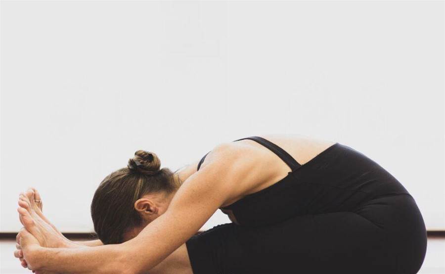 手杖式坐立,手臂伸過頭頂,然后從髖部向前屈,用手夠腳趾。保持背部挺直,腹部抵住大腿,額頭碰小腿。保持體式20秒。